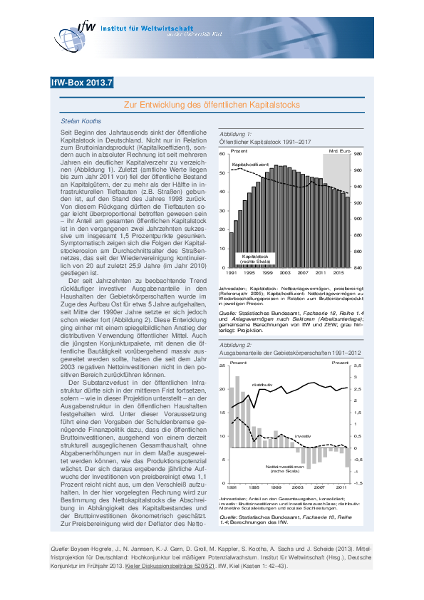 Seit Beginn des Jahrtausends sinkt der öffentliche Kapitalstock in Deutschland. Nicht nur in Relation zum Bruttoinlandsprodukt (Kapitalkoeffizient), sondern auch in absoluter Rechnung ist seit mehreren Jahren ein deutlicher Kapitalverzehr zu verzeichnen. Zuletzt (amtliche Werte liegen bis zum Jahr 2011 vor) fiel der öffentliche Bestand an Kapitalgütern, der zu mehr als der Hälfte in infrastrukturellen Tiefbauten (z.B. Straßen) gebunden ist, auf den Stand des Jahres 1998 zurück. Von diesem Rückgang dürften die Tiefbauten sogar leicht überproportional betroffen gewesen sein – ihr Anteil am gesamten öffentlichen Kapitalstock ist in den vergangenen zwei Jahrzehnten sukzessive um insgesamt 1,5 Prozentpunkte gesunken. Symptomatisch zeigen sich die Folgen der Kapitalstockerosion am Durchschnittsalter des Straßennetzes, das seit der Wiedervereinigung kontinuierlich von 20 auf zuletzt 25,9 Jahre (im Jahr 2010) gestiegen ist.