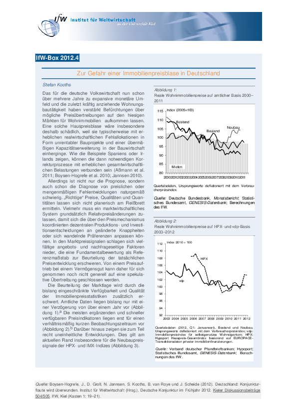 Das für die deutsche Volkswirtschaft nun schon über mehrere Jahre zu expansive monetäre Umfeld und die zuletzt kräftig anziehende Wohnungsbautätigkeit haben verstärkt Befürchtungen über mögliche Preisübertreibungen auf den hiesigen Märkten für Wohnimmobilien aufkommen lassen. Eine solche Hauspreisblase wäre insbesondere deshalb schädlich, weil sie typischerweise mit erheblichen realwirtschaftlichen Fehlallokationen in Form unrentabler Bauprojekte und einer übermäßigen Kapazitätserweiterung in der Bauwirtschaft einherginge. Wie die Beispiele Spaniens oder Irlands zeigen, können die dann notwendigen Korrekturprozesse mit erheblichen gesamtwirtschaftlichen Belastungen verbunden sein.