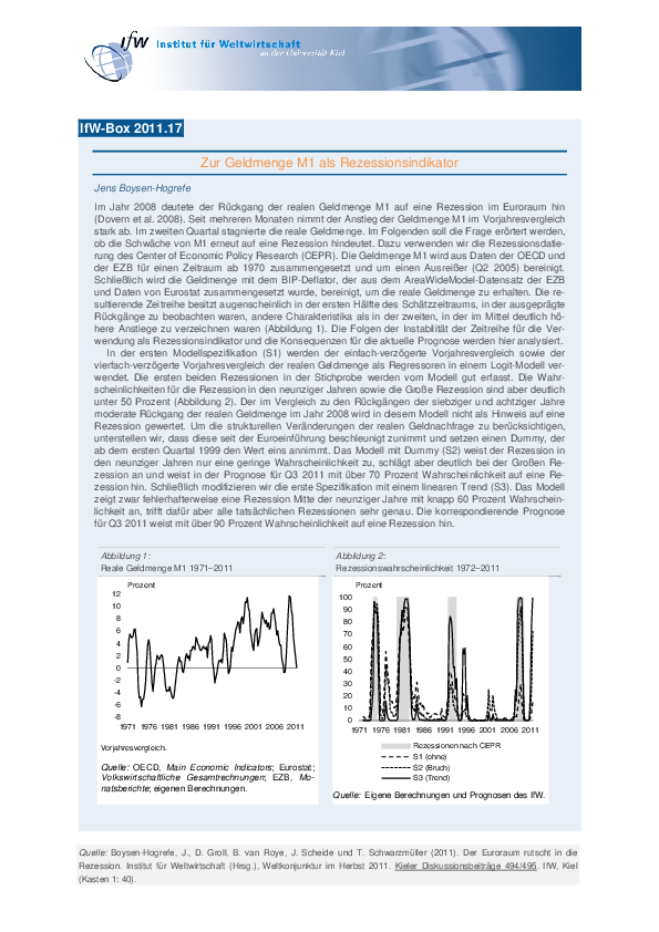 Im Jahr 2008 deutete der Rückgang der realen Geldmenge M1 auf eine Rezession im Euroraum hin. Seit mehreren Monaten nimmt der Anstieg der Geldmenge M1 im Vorjahresvergleich stark ab. Im zweiten Quartal stagnierte die reale Geldmenge. Im Folgenden soll die Frage erörtert werden, ob die Schwäche von M1 erneut auf eine Rezession hindeutet. Dazu verwenden wir die Rezessionsdatierung des Center of Economic Policy Research (CEPR). Die Geldmenge M1 wird aus Daten der OECD und der EZB für einen Zeitraum ab 1970 zusammengesetzt und um einen Ausreißer (Q2 2005) bereinigt. Schließlich wird die Geldmenge mit dem BIP-Deflator, der aus dem AreaWideModel-Datensatz der EZB und Daten von Eurostat zusammengesetzt wurde, bereinigt, um die reale Geldmenge zu erhalten. Die resultierende Zeitreihe besitzt augenscheinlich in der ersten Hälfte des Schätzzeitraums, in der ausgeprägte Rückgänge zu beobachten waren, andere Charakteristika als in der zweiten, in der im Mittel deutlich höhere Anstiege zu verzeichnen waren. Die Folgen der Instabilität der Zeitreihe für die Verwendung als Rezessionsindikator und die Konsequenzen für die aktuelle Prognose werden hier analysiert.
