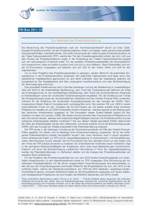Die Berechnung des Produktionspotentials nach der Kommissionsmethodea beruht auf einer Cobb-Douglas-Produktionsfunktion mit den Produktionsfaktoren Arbeit und Kapital, wobei abnehmende partielle Grenzproduktivitäten unterstellt werden. Die dritte Komponente der Cobb-Douglas-Produktionsfunktion ist die Totale Faktorproduktivität (TFP), welche den Teil des Produktionspotentials erklärt, der sich nicht aus dem Einsatz der Produktionsfaktoren ergibt. In der Entwicklung der Totalen Faktorproduktivität spiegelt sich der technologische Fortschritt wider. Für die partiellen Produktionselastizitäten der Einsatzfaktoren wird angenommen, dass sie zeitlich konstant sind und sich zu eins addieren. Diese Elastizitäten sind von der EU-Kommission vorgegeben und belaufen sich auf 0,65 für den Faktor Arbeit und 0,35 für den Kapitaleinsatz.