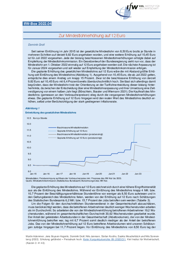 Seit seiner Einführung im Jahr 2015 ist der gesetzliche Mindestlohn von 8,50 Euro brutto je Stunde in mehreren Schritten auf derzeit 9,82 Euro angehoben worden, und eine weitere Erhöhung auf 10,45 Euro ist für Juli 2022 vorgesehen. Jede der bislang beschlossenen Mindestlohnerhöhungen erfolgte dabei auf Empfehlung der Mindestlohnkommission. Ein Gesetzentwurf der Bundesregierung sieht nun vor, dass der Mindestlohn am 1. Oktober 2022 einmalig auf 12 Euro angehoben werden soll. Die nächste Anpassung ist für Januar 2024 vorgesehen und soll wieder auf Empfehlung der Mindestlohnkommission erfolgen.