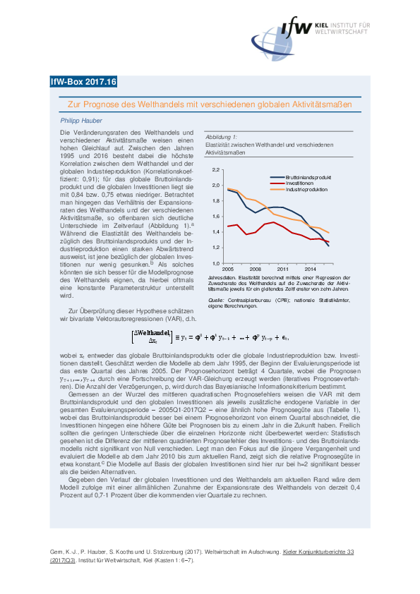 Die Veränderungsraten des Welthandels und verschiedener Aktivitätsmaße weisen einen hohen Gleichlauf auf. Zwischen den Jahren 1995 und 2016 besteht dabei die höchste Korrelation zwischen dem Welthandel und der globalen Industrieproduktion (Korrelationskoef-fizient: 0,91); für das globale Bruttoinlandsprodukt und die globalen Investitionen liegt sie mit 0,84 bzw. 0,75 etwas niedriger. Betrachtet man hingegen das Verhältnis der Expansionsraten des Welthandels und der verschiedenen Aktivitätsmaße, so offenbaren sich deutliche Unterschiede im Zeitverlauf. Während die Elastizität des Welthandels bezüglich des Bruttoinlandsprodukts und der Industrieproduktion einen starken Abwärtstrend ausweist, ist jene bezüglich der globalen Investitionen nur wenig gesunken. Als solches könnten sie sich besser für die Modellprognose des Welthandels eignen, da hierbei oftmals eine konstante Parameterstruktur unterstellt wird.