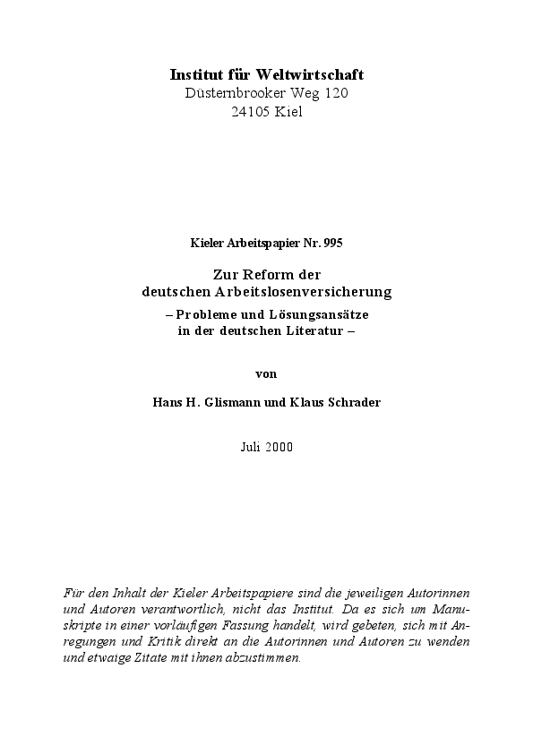 Zur Reform der deutschen Arbeitslosenversicherung - Probleme und Lösungsansätze in der deutschen Literatur