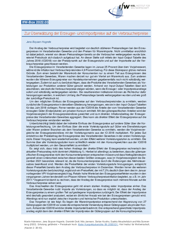 Der Anstieg der Verbraucherpreise wird begleitet von deutlich stärkeren Preisanstiegen bei den Erzeugerpreisen im Verarbeitenden Gewerbe und den Preisen für Warenimporte. Nicht unmittelbar ersichtlich ist dabei jedoch, wieviel von diesen Preisanstiegen bereits an die Verbraucher weitergegeben wurde bzw. wieviel Preisdruck noch in der Pipeline ist. In diesem Beitrag wird mittels der Input-Output-Tabelle des Jahres 2018 (IO2018) von der Preisdynamik auf der Erzeugerstufe und auf der Importseite auf die der Verbraucherpreise geschlossen. Demnach sind die Preisanstiege bei Erzeuger- und Importpreisen aus der zweiten Jahreshälfte 2021 bis zum Februar 2022 noch nicht vollständig auf der Verbraucherpreisebene angekommen.