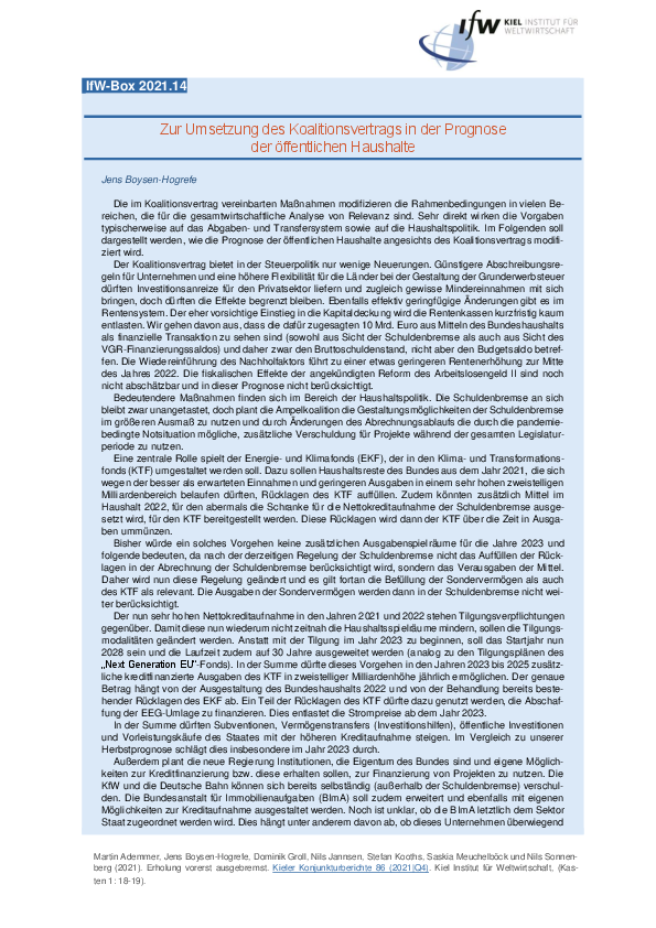 Die im Koalitionsvertrag vereinbarten Maßnahmen modifizieren die Rahmenbedingungen in vielen Bereichen, die für die gesamtwirtschaftliche Analyse von Relevanz sind. Sehr direkt wirken die Vorgaben typischerweise auf das Abgaben- und Transfersystem sowie auf die Haushaltspolitik. Im Folgenden soll dargestellt werden, wie die Prognose der öffentlichen Haushalte angesichts des Koalitionsvertrags modifiziert wird.