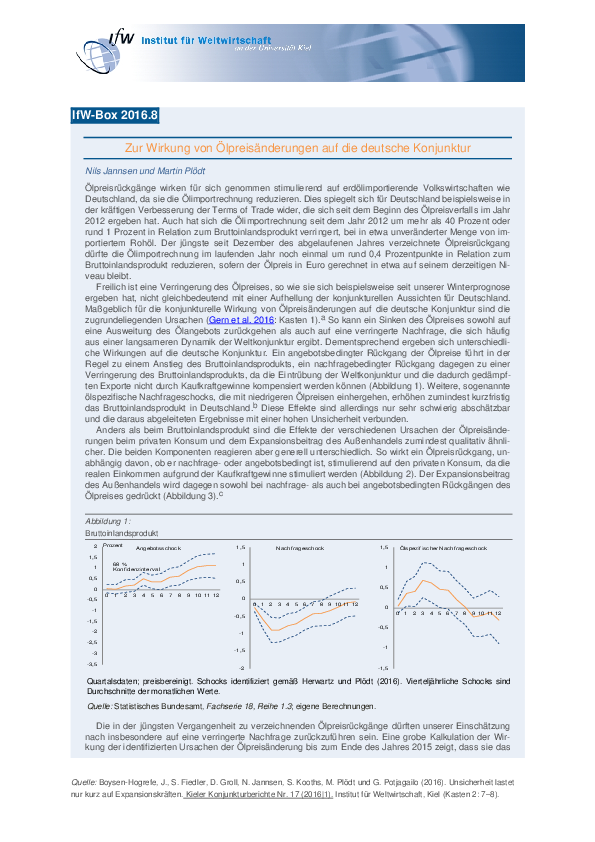 Ölpreisrückgänge wirken für sich genommen stimulierend auf erdölimportierende Volkswirtschaften wie Deutschland, da sie die Ölimportrechnung reduzieren. Dies spiegelt sich für Deutschland beispielsweise in der kräftigen Verbesserung der Terms of Trade wider, die sich seit dem Beginn des Ölpreisverfalls im Jahr 2012 ergeben hat. Auch hat sich die Ölimportrechnung seit dem Jahr 2012 um mehr als 40 Prozent oder rund 1 Prozent in Relation zum Bruttoinlandsprodukt verringert, bei in etwa unveränderter Menge von importiertem Rohöl. Der jüngste seit Dezember des abgelaufenen Jahres verzeichnete Ölpreisrückgang dürfte die Ölimportrechnung im laufenden Jahr noch einmal um rund 0,4 Prozentpunkte in Relation zum Bruttoinlandsprodukt reduzieren, sofern der Ölpreis in Euro gerechnet in etwa auf seinem derzeitigen Niveau bleibt.