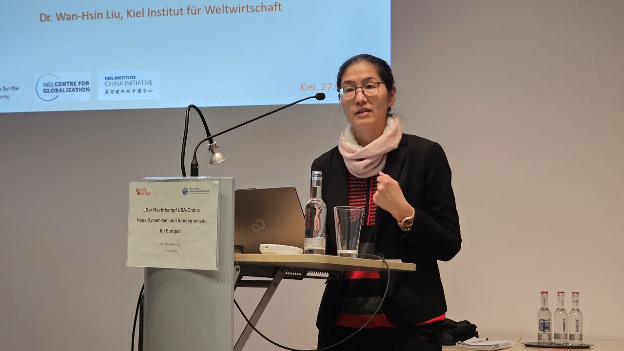 Frau Dr. Wan-Hsin Liu, Senior-Forscherin in den Forschungsgruppen „Internationaler Handel und Investitionen“ sowie „Konjunktur und Wachstum“ am Kiel Institut für Weltwirtschaft und Ko-Organisatorin der China Initiative des Kiel Instituts stellte in ihrem Vortrag heraus, dass die Rivalität zwischen USA und China schon mit der Bekanntgabe des Chinesischen Traums „Make China great again“ vom Nov. 2012 sowie dem Beginn der MAGA-Kampagne in den USA ab Juni 2015 schon viele Jahre betrieben wird. Im globalen Handel gibt es einen Trend zu steigendem Anteil am Welthandel für China bei gleichzeitig sinkendem Anteil der USA. In Bezug auf Schlüsseltechnologien setzt China auf E-Autos, E-Batterien und Solarpaneelen, während die USA ihre Vorherrschaft auf künstliche Intelligenz gründen will. Geopolitisch hat China strategische Vorteile bei wichtigen Rohstoffen wie seltenen Erden und gibt zu erkennen, dass dies ausgenutzt werden kann. Zwischen diesen Polen muss sich die EU behaupten, wobei die EU in vielen Dingen von den USA (technologische Kooperation, NATO-Beistand) und von China (Exportmarkt) abhängig ist.