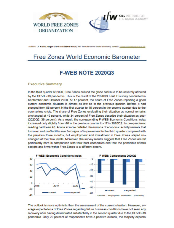 In the third quarter of 2020, Free Zones around the globe continue to be severely affected by the COVID-19 pandemic. This is the result of the 2020Q3 F-WEB survey conducted in September and October 2020. At 17 percent, the share of Free Zones reporting a good current economic situation is almost as low as in the previous quarter. Before, it had plunged from 56 percent in the first quarter to 15 percent in the second quarter due to the coronavirus crisis. The share of Free Zones evaluating their situation as normal remains unchanged at 49 percent, while 34 percent of Free Zones describe their situation as poor (2020Q2: 36 percent). As a result, the corresponding F-WEB Economic Conditions Index increased only slightly from -20 in the previous quarter to -17 in 2020Q3. Its pre-pandemic reading had been 48. A look at more detailed dimensions of economic activity reveals that turnover and profitability saw first signs of improvement in the third quarter compared with the previous three months, but employment and investment in Free Zones stayed unchanged at their low levels. Moreover, the survey results suggest that Free Zones are hit particularly hard in comparison with their host economies and that the pandemic affects sectors and firms within Free Zones to a different extent.