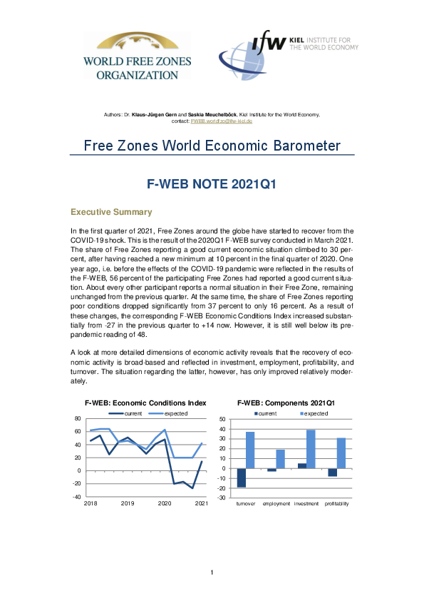 In the first quarter of 2021, Free Zones around the globe have started to recover from the COVID-19 shock. This is the result of the 2020Q1 F-WEB survey conducted in March 2021. The share of Free Zones reporting a good current economic situation climbed to 30 percent, after having reached a new minimum at 10 percent in the final quarter of 2020. One year ago, i.e. before the effects of the COVID-19 pandemic were reflected in the results of the F-WEB, 56 percent of the participating Free Zones had reported a good current situation. About every other participant reports a normal situation in their Free Zone, remaining unchanged from the previous quarter. At the same time, the share of Free Zones reporting poor conditions dropped significantly from 37 percent to only 16 percent. As a result of these changes, the corresponding F-WEB Economic Conditions Index increased substantially from -27 in the previous quarter to +14 now. However, it is still well below its prepandemic reading of 48.