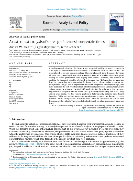In environmental valuation, the issue of the temporal stability of stated preferences to changes in environmental (dis)amenities is important because their results can be employed to inform decision-making. This includes cost–benefit analysis for large infrastructure projects such as coastal protection. A couple of studies have investigated stability of stated preferences over varying time periods. However, less evidence is available for temporal stability of stated preferences for (dis)amenities in uncertain times, i.e., times that are characterised by larger degrees of uncertainty regarding the (near) future. Using a choice experiment on coastal adaptation to climate change, this paper examines the test-retest reliability of individual preferences and resulting welfare estimates over the course of the Covid-19 pandemic. We do so by surveying the same respondents at two points in time five months apart during the ongoing pandemic. Using a latent class model, we find similar preference heterogeneity patterns but different class sizes at the two points in time. While the welfare measure of an adaptation scenario that focuses on safety increases across survey waves, scenarios that centre on recreation or nature have decreasing welfare effects. This suggests that individuals set other priorities in uncertain times.