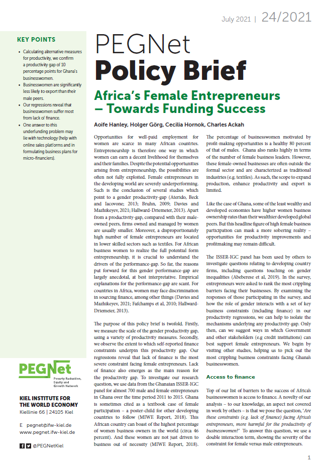 Opportunities for well-paid employment for women are scarce in many African countries. Entrepreneurship is therefore one way in which women can earn a decent livelihood for themselves and their families. Despite the potential opportunities arising from entrepreneurship, the possibilities are often not fully exploited. Female entrepreneurs in the developing world are severely underperforming. In this PEGNet Policy Brief “Africa’s Female Entrepreneurs – Towards Funding Success” by Aoife Hanley, Holger Görg, Cecilia Hornok and Charles Ackah, the authors examine the scale of the gender productivity gap in African countries and how finance constraints underpin this gap.