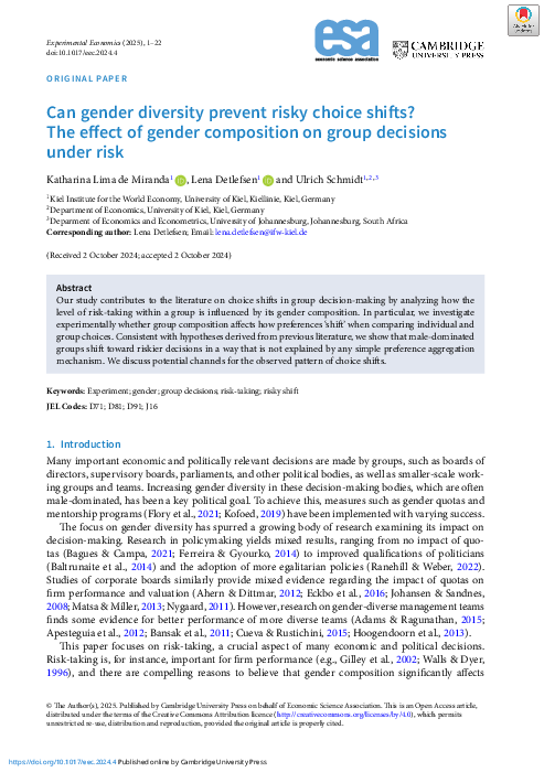 Our study contributes to the literature on choice shifts in group decision-making by analyzing how the level of risk-taking within a group is influenced by its gender composition. In particular, we investigate experimentally whether group composition affects how preferences ‘shift’ when comparing individual and group choices. Consistent with hypotheses derived from previous literature, we show that male-dominated groups shift toward riskier decisions in a way that is not explained by any simple preference aggregation mechanism. We discuss potential channels for the observed pattern of choice shifts.