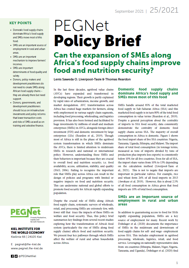 In the last three decades, agrifood value chains (AVCs) have expanded and transformed in developing regions. AVC transformation across Africa has created huge markets for farmers, along with employment in various supply chain segments, including food processing, wholesaling, and logistics provision. Thereby, domestic food supply chains dominate Africa’s food supply and SMEs move most of this food. Understanding these SMEs and their behaviours is important to be able to design policies and programs with positive impacts on food and nutrition security. This raises the question on whether the expansion of SMEs along Africa’s food supply chains can improve food and nutrition security.