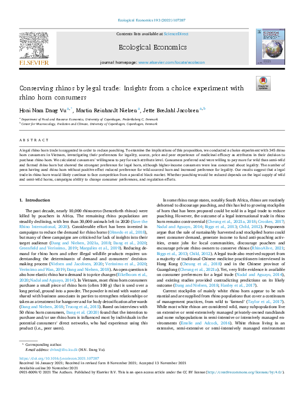 A legal rhino horn trade is suggested in order to reduce poaching. To examine the implications of this proposition, we conducted a choice experiment with 345 rhino horn consumers in Vietnam, investigating their preferences for legality, source, price and peer experience of medicinal efficacy as attributes in their decision to purchase rhino horn. We calculated consumers' willingness to pay for each attribute level. Consumers preferred and were willing to pay more for wild than semi-wild and farmed rhino horn but showed the strongest preference for legal horn, although higher-income consumers were less concerned about legality. The number of peers having used rhino horn without positive effect reduced preference for wild-sourced horn and increased preference for legality. Our results suggest that a legal trade in rhino horn would likely continue to face competition from a parallel black market. Whether poaching would be reduced depends on the legal supply of wild and semi-wild horns, campaigns ability to change consumer preferences, and regulation efforts.