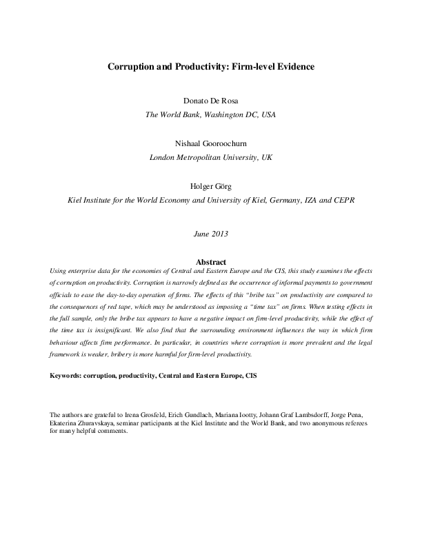 Using enterprise data for the economies of Central and Eastern Europe and the CIS, this study examines the effects of corruption on productivity. Corruption is narrowly defined as the occurrence of informal payments to government officials to ease the day-to-day operation of firms. The effects of this “bribe tax” on productivity are compared to the consequences of red tape, which may be understood as imposing a “time tax” on firms. When testing effects in the full sample, only the bribe tax appears to have a negative impact on firm-level productivity, while the effect of the time tax is insignificant. We also find that the surrounding environment influences the way in which firm behaviour affects firm performance. In particular, in countries where corruption is more prevalent and the legal framework is weaker, bribery is more harmful for firm-level productivity.