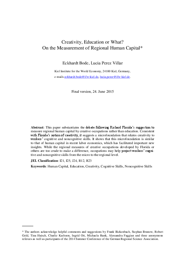 This paper substantiates the debate following Richard Florida’s suggestion to measure regional human capital by creative occupations rather than education. Consistent with Florida’s notion of creativity, it suggests a microfoundation that relates creativity to workers’ cognitive and noncognitive skills. It shows that this microfoundation is similar to that of human capital in recent labor economics, which has facilitated important new insights. It also shows that Florida’s measure is too crude to make a difference. Nonethe-less, it is time to rethink regional human capital. Occupations may help project workers’ cognitive and noncognitive skills from the micro to the regional level.