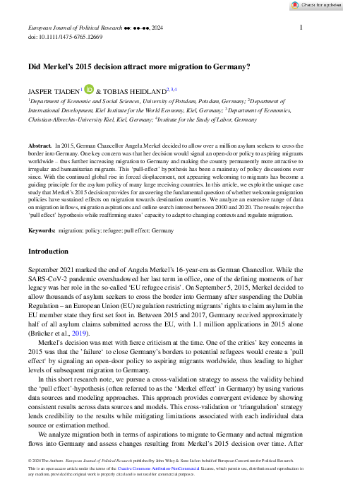 In 2015, German Chancellor Angela Merkel decided to allow over a million asylum seekers to cross the border into Germany. One key concern was that her decision would signal an open-door policy to aspiring migrants worldwide – thus further increasing migration to Germany and making the country permanently more attractive to irregular migrants. This “pull-effect” hypothesis has been a mainstay of policy discussions ever since. With the continued global rise in forced displacement, not appearing welcoming to migrants has become a guiding principle for the asylum policy of many large receiving countries. In this article, we exploit the unique case study that Merkel’s 2015 decision provides for answering the fundamental question of whether welcoming migration policies have sustained effects on migration towards destination countries. We analyze an extensive range of data on migration inflows, migration aspirations, and online search interest between 2000 and 2020. The results reject the “pull effect” hypothesis while reaffirming states’ capacity to adapt to changing contexts and regulate migration.