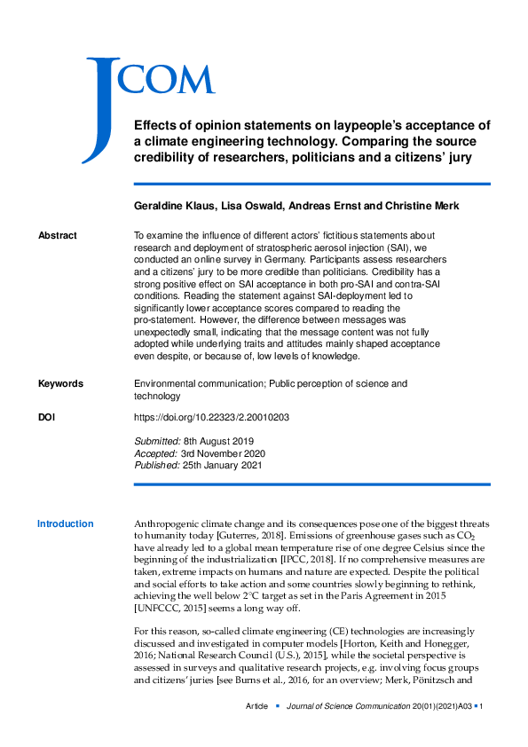 Effects of opinion statements on laypeople’s acceptance of a climate engineering technology. Comparing the source credibility of researchers, politicians and a citizens’ jury