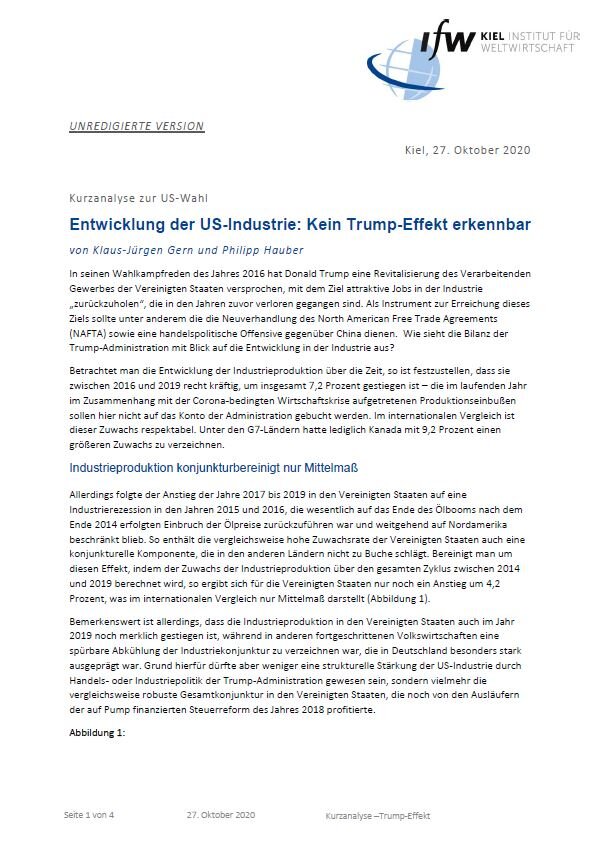Trump has failed with his campaign promises to achieve complete revitalization of the US manufacturing industry. His economic policy has not led to any substantial improvement. Even the industries that enjoyed particular protection by the Trump administration's trade policy are not showing extraordinarily strong developments. In the automotive industry, the situation has actually deteriorated somewhat.