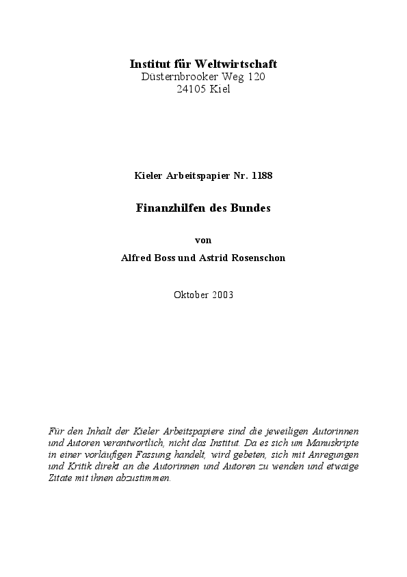 Subsidization policy is intensively discussed in Germany. Subsidies comprise by definition tax expenditures and those government expenditures which distort the structure of the economy; financial aid is granted to different branches by the EU, the federal government, the states (Länder) and the local authorities. The extent and the structure of the federal government's subsidies in the period 1998 to 2003 are analyzed. The results are compared to the data in the official report of the federal government released in October 2003 and to the data on which a reform proposal of the Prime Ministers of the states Hessia and North Rhine-Westphalia is based on.