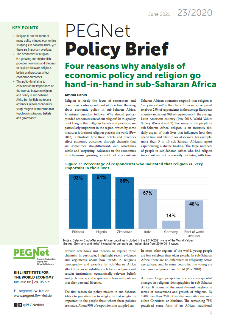 Religion is not the focus of many policy minded economists studying sub-Saharan Africa; yet, there are important overlaps. The economics of religion is a growing sub-field which provides new tools and theories to explore the ways religious beliefs and practices affect economic outcomes. This policy brief written by Amma Panin aims to convince of the importance of the overlap between religion and policy in sub-Saharan Africa by highlighting recent advances in how economists study religion, with results that touch on institutions, beliefs and governance