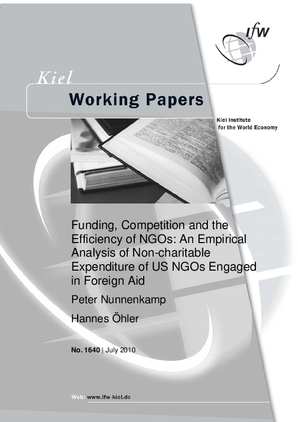 We assess the determinants of the wide variation in the efficiency of foreign aid activities across US-based non-governmental organizations (NGOs). In particular, we analyze whether non-charitable expenditures for administration, management and fundraising depend on the intensity of competition among NGOs and on the degree to which they are refinanced by governments. We control for NGO heterogeneity in various dimensions as well as major characteristics of recipient countries. We find that fiercer competition is associated with more efficient foreign aid activities of NGOs, rather than leading to “excessive” fundraising. Official funding tends to increase administrative costs. Nevertheless, officially financed NGOs spend relatively more on charitable activities since they are less concerned with collecting private donations through fundraising efforts.