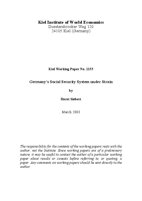 Germany's social security system is surveyed, its benefits and contributions are discussed. The expansion of this system in the last decades is described, its impact on employment and growth is studied and proposals for the reform of the system are discussed.