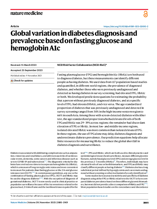 Fasting plasma glucose (FPG) and hemoglobin A1c (HbA1c) are both used to diagnose diabetes, but these measurements can identify diferent people as having diabetes. We used data from 117 population-based studies and quantifed, in diferent world regions, the prevalence of diagnosed diabetes, and whether those who were previously undiagnosed and detected as having diabetes in survey screening, had elevated FPG, HbA1c or both. We developed prediction equations for estimating the probability that a person without previously diagnosed diabetes, and at a specifc level of FPG, had elevated HbA1c, and vice versa. The age-standardized proportion of diabetes that was previously undiagnosed and detected in survey screening ranged from 30% in the high-income western region to 66% in south Asia. Among those with screen-detected diabetes with either test, the age-standardized proportion who had elevated levels of both FPG and HbA1c was 29–39% across regions; the remainder had discordant elevation of FPG or HbA1c. In most low- and middle-income regions, isolated elevated HbA1c was more common than isolated elevated FPG. In these regions, the use of FPG alone may delay diabetes diagnosis and underestimate diabetes prevalence. Our prediction equations help allocate fnite resources for measuring HbA1c to reduce the global shortfall in diabetes diagnosis and surveillance.