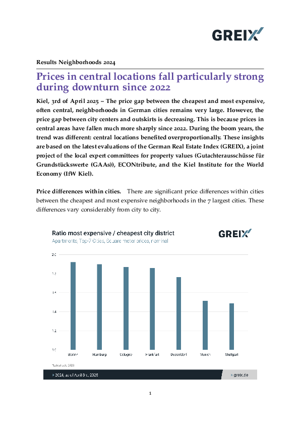 The price gap between the cheapest and most expensive, often central, neighborhoods in German cities remains very large. However, the price gap between city centers and outskirts is decreasing. This is because prices in central areas have fallen much more sharply since 2022. During the boom years, the trend was different: central locations benefited overproportionally. These insights are based on the latest evaluations of the German Real Estate Index (GREIX), a joint project of the local expert committees for property values (Gutachterausschüsse für Grundstückswerte (GAAs)), ECONtribute, and the Kiel Institute for the World Economy (IfW Kiel).