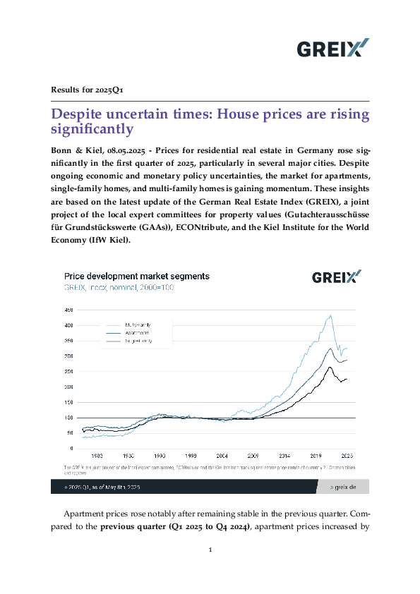 Policy Article GREIX Q1 2025 - Despite uncertain times: House prices are rising significantly Download Share X Facebook Xing LinkedIn Bluesky Copy link PDF Download → German Press Release → English Press Release → Greix Website Authors Zdrzalek J. Zetzmann S. Amaral F. Publication Date 05/2025 Key Words Real estate market Housing price indices Cities Germany Related Topics Real Estate Market Germany Kiel Institute Experts Francisco Amaral Kiel Institute Fellow Steffen Zetzmann Kiel Institute Researcher Dr. Jonas Zdrzalek Kiel Institute Researcher