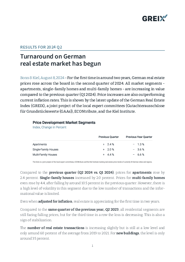 For the first time in around two years, German real estate prices rose across the board in the second quarter of 2024. All market segments – apartments, single-family homes and multi-family homes – are increasing in value compared to the previous quarter (Q1 2024). Price increases are also outperforming current inflation rates. This is shown by the latest update of the German Real Estate Index (GREIX), a joint project of the local expert committees (Gutachterausschüsse für Grundstückswerte (GAAs)), ECONtribute, and the Kiel Institute.