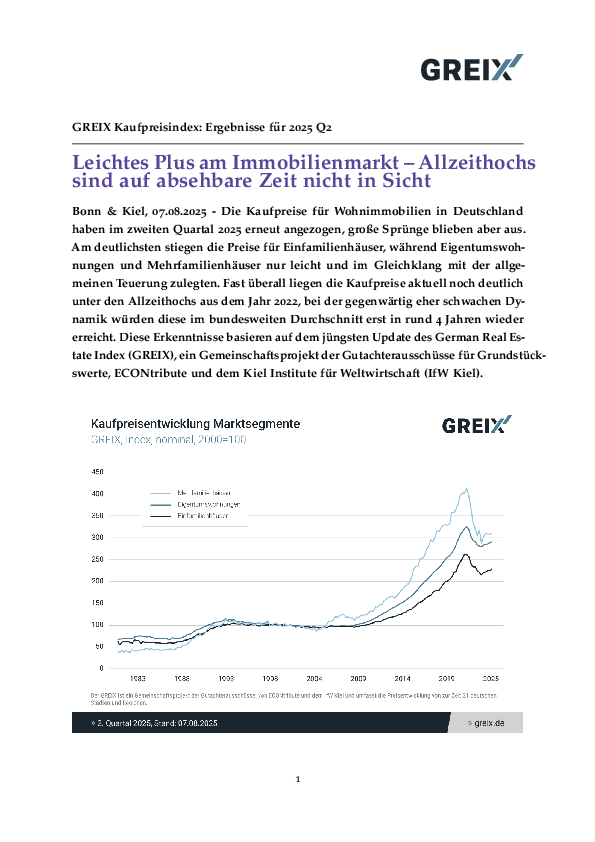 In the second quarter of 2025, prices for residential real estate in Germany continued their upward trend, though without significant acceleration. The strongest gains were seen in single-family houses, while apartments and multi-family houses saw only modest increases, roughly in line with overall inflation. In most regions, prices remain well below their 2022 peaks. Given the current sluggish momentum, it is not expected that those levels will be reached again – on average nationwide – for another four years. These insights are based on the latest update of the German Real Estate Index (GREIX), a joint project of the local expert committees for property values (Gutachterausschüsse für Grundstückswerte (GAAs)), ECONtribute, and the Kiel Institute for the World Economy (IfW Kiel).