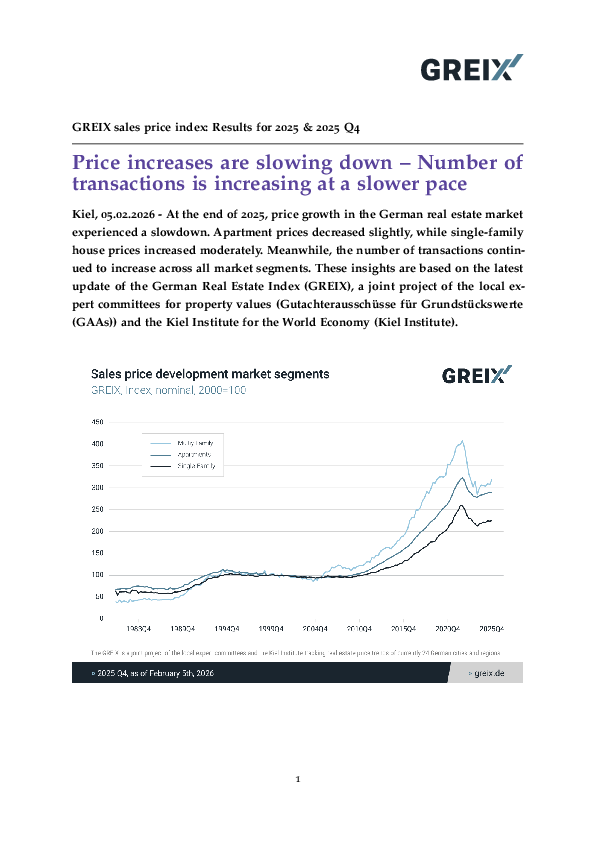 At the end of 2025, price growth in the German real estate market experienced a slowdown. Apartment prices decreased slightly, while single-family house prices increased moderately. Meanwhile, the number of transactions continued to increase across all market segments. These insights are based on the latest update of the German Real Estate Index (GREIX), a joint project of the local expert committees for property values (Gutachterausschüsse für Grundstückswerte (GAAs)) and the Kiel Institute for the World Economy (Kiel Institute)
