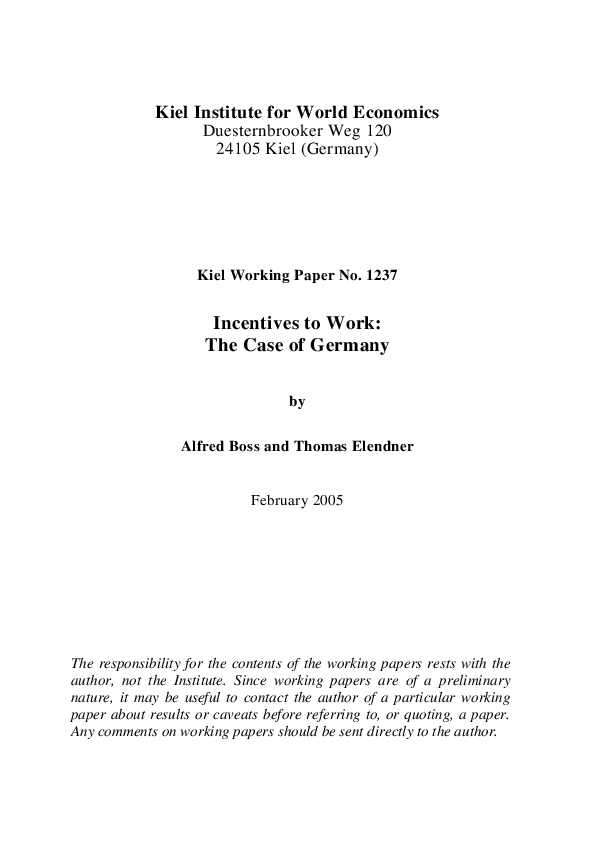 Based on a description of the German system of taxes and transfers, the incentives to work are analyzed for several groups of the labor force. The effects of the Hartz IV reform (effective from 2005 onwards) on the incentives receive particular attention. It turns out that the marginal (explicit and implicit) tax rates for most groups of the labor force remain high. It is concluded that employment probably will not be affected significantly by that part of the reform which aims at strengthening the incentives to work. Other elements of Hartz IV are only touched on.