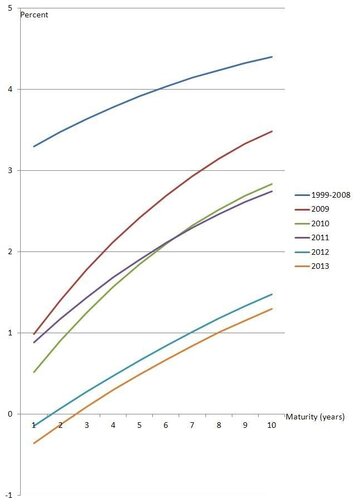 Yields for German government bonds reached record lows in recent months. The downturn in yields has now lasted since the start of the Great Recession, apart from a short disruption in the first half of 2011, and this has affected bills and bonds over all maturities. Papers with short maturities have partly reached negative yields. Having these low yields for such a long time have made a sizable relief for the public budget in Germany.