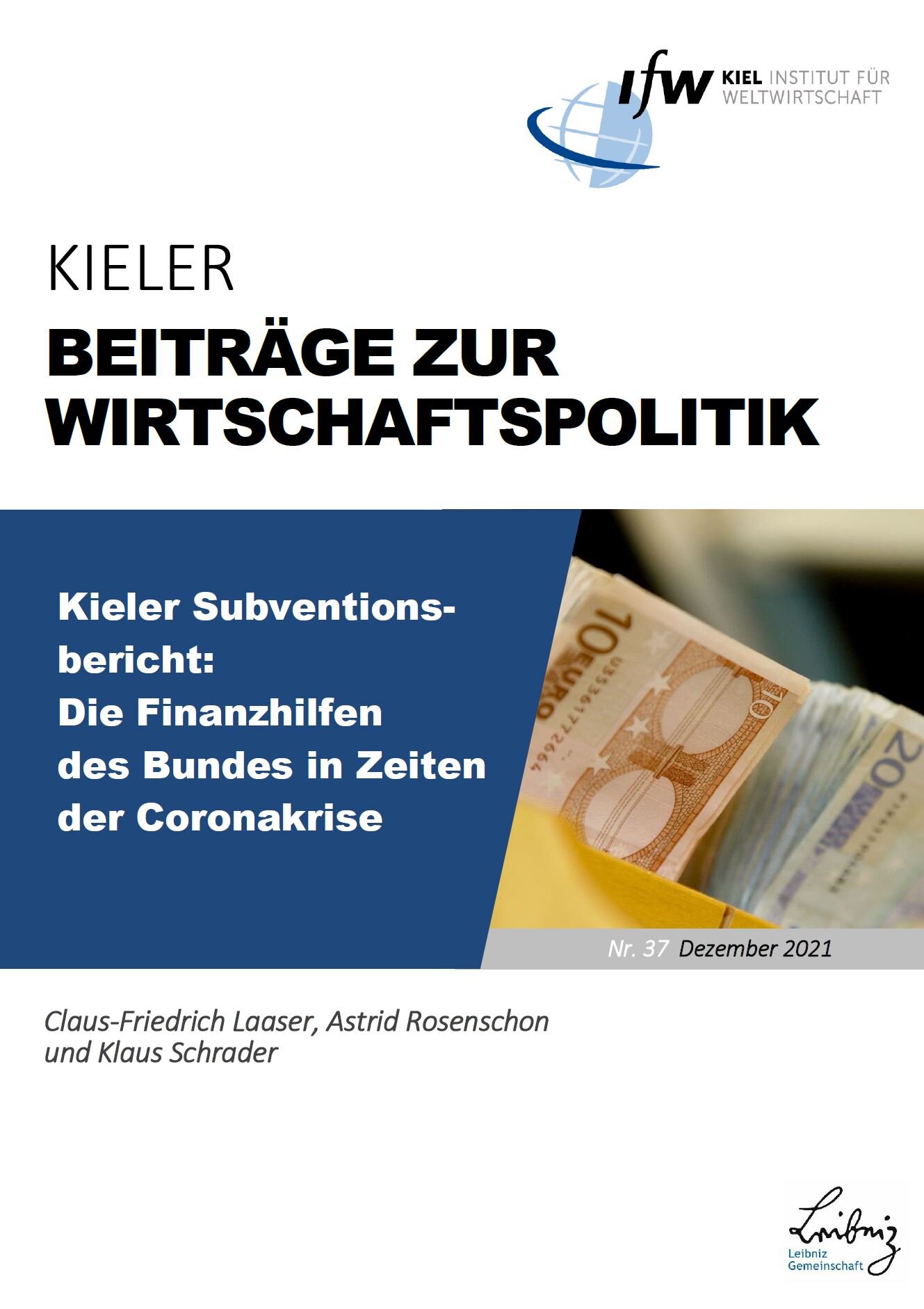 The present Kiel subsidy report focuses on the analysis of federal financial assistance in 2021 and the extent to which expenditures in 2020 and 2021 related to the Corona pandemic are subsidies. The authors show that since 2014, federal financial assistance has been on an expansionary trajectory. Including grants from the Future Package, they are expected to rise to an all-time high of 87.2 billion euros in 2021. This means additional spending of EUR 30 billion, or an increase of 52.4 percent compared with the actual figure of EUR 57.2 billion in 2019. At the same time, the federal government's financial assistance is highly concentrated: The five most weighty items account for 51 percent of the financial aid volume in 2021, while the ten most weighty items account for 62.8 percent. The authors observe a particularly strong increase of 36.5 percent in cross-industry aid, for which is explained by the increase in environmental subsidies as part of the federal government's Future Package. Spending under the Future Package, which was launched in the wake of the Corona crisis to stimulate the German economy, is mostly in the nature of a subsidy, unlike federal spending directly related to the pandemic. Financial assistance from this package totals EUR 2.2 billion in 2020 and EUR 18.9 billion in 2021.