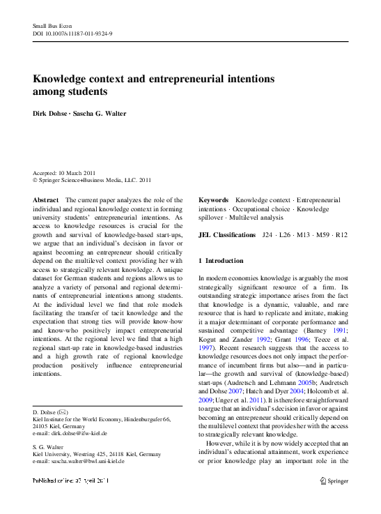 Based on the predictions from recent theoretical developments the focus of the current paper is on the access to knowledge and, in particular, on the role of the individual and regional knowledge context. Making use of a unique dataset for German students and regions allows us to analyze a variety of personal and regional determinants of entrepreneurial intentions among students.