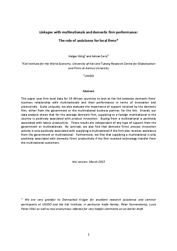 This paper uses firm level data for 19 African countries to look at the link between domestic firms’ business relationship with multinationals and their performance in terms of innovation and productivity. Quite uniquely, we also evaluate the importance of support received by the domestic firm, either from the government or the multinational business partner, for this link. Overall, our data analysis shows that for the average domestic firm, supplying to a foreign multinational in the country is positively associated with product innovation. Buying from a multinational is positively associated with labour productivity. These results are independent of any type of support from the government or multinationals. By contrast, we also find that domestic firms’ process innovation activity is only positively associated with supplying a multinational if the firm also receives assistance from the government or multinational. Furthermore, we find that supplying a multinational is only positively associated with domestic firms’ productivity if the firm received technology transfer from the multinational customers.