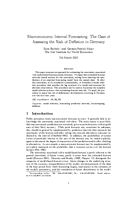 This paper proposes an approach for estimating the uncertainty associated with model-based macroeconomic forecasts. We argue that estimated forecast intervals should account for the uncertainty arising from selecting the specification of an empirical forecasting model from the sample data. To allow this uncertainty to be considered systematically, we formalize a model selection procedure that specifies the lag structure of a model and accounts for aberrant observations. The procedure can be used to bootstrap the complete model selection process when estimating forecast intervals. We apply the procedure to assess the risk of deflationary developments occurring in Germany over the next four years.