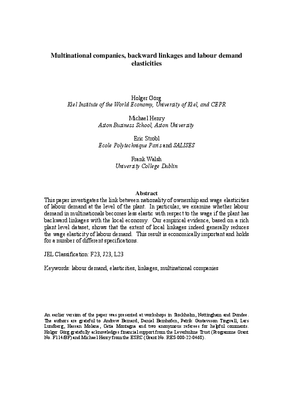 This paper investigates the link between nationality of ownership and wage elasticities of labour demand at the level of the plant. In particular, we examine whether labour demand in multinationals becomes less elastic with respect to the wage if the plant has backward linkages with the local economy. Our empirical evidence, based on a rich plant level dataset, shows that the extent of local linkages indeed generally reduces the wage elasticity of labour demand. This result is economically important and holds for a number of different specifications.