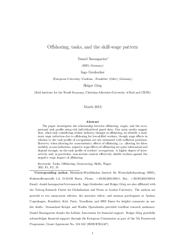 The paper investigates the relationship between offshoring, wages, and the occupational task profile using rich individual-level panel data. Our main results suggest that, when only considering within- industry changes in offshoring, we identify a moderate wage reduction due to offshoring for low-skilled workers, though wage effects in relation to the task profile of occupations are not estimated with sufficient precision. However, when allowing for cross-industry effects of offshoring, i.e. allowing for labor mobility across industries, negative wage effects of offshoring are quite substantial and depend strongly on the task profile of workers’ occupations. A higher degree of interactivity and, in particular, non-routine content effectively shields workers against the negative wage impact of offshoring.