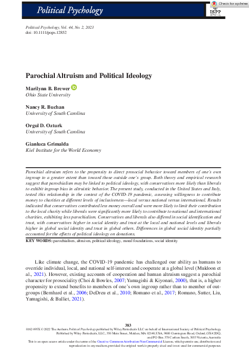 Parochial altruism refers to the propensity to direct prosocial behavior toward members of one's own ingroup to a greater extent than toward those outside one's group. Both theory and empirical research suggest that parochialism may be linked to political ideology, with conservatives more likely than liberals to exhibit ingroup bias in altruistic behavior. The present study, conducted in the United States and Italy, tested this relationship in the context of the COVID-19 pandemic, assessing willingness to contribute money to charities at different levels of inclusiveness—local versus national versus international. Results indicated that conservatives contributed less money overall and were more likely to limit their contribution to the local charity while liberals were significantly more likely to contribute to national and international charities, exhibiting less parochialism. Conservatives and liberals also differed in social identification and trust, with conservatives higher in social identity and trust at the local and national levels and liberals higher in global social identity and trust in global others. Differences in global social identity partially accounted for the effects of political ideology on donations.
