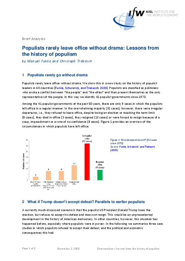 Among 41 populist governments of the past 50 years, there are only 9 cases in which the populists left office in a regular manner. In the overwhelming majority (32 cases), however, there were irregular departures, i.e., they refused to leave office, despite losing an election or reaching the term limit (8 cases), they died in office (3 cases), they resigned (13 cases) or were forced to resign because of a coup, impeachment or a vote of no confidence (8 cases).