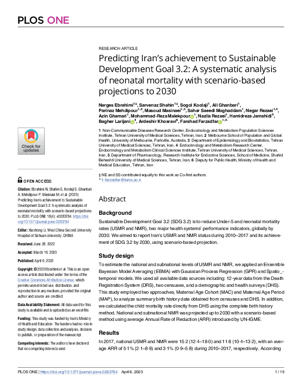 In 2017, national U5MR and NMR were 15·2 (12·4–18·0) and 11·8 (10·4–13·2), with an average ARR of 5·1% (2·1–8·9) and 3·1% (0·9–5·8) during 2010–2017, respectively. According to our projection scenarios, 17 provinces have not fulfilled SDG 3.2 for NMR yet, and the current trend (the current trend of NMR improvement in Iran) will not result in reaching SDG for some provinces by 2030; However, if each province has the same neonatal mortality annual reduction rate as the best-performing province in the same region, besides achieving SDG, the national NMR will be reduced to 5·2, and almost 92,000 newborn lives will be saved.