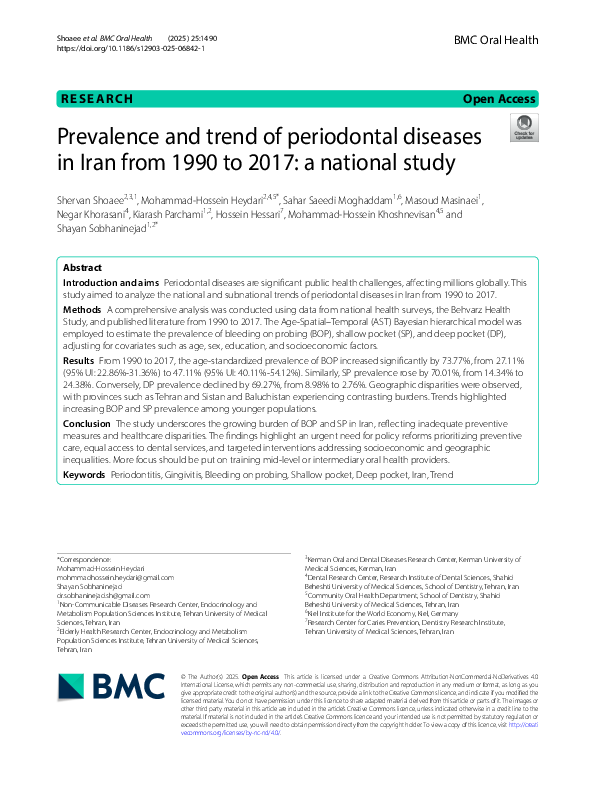 The study underscores the growing burden of BOP and SP in Iran, reflecting inadequate preventive measures and healthcare disparities. The findings highlight an urgent need for policy reforms prioritizing preventive care, equal access to dental services, and targeted interventions addressing socioeconomic and geographic inequalities. More focus should be put on training mid-level or intermediary oral health providers.