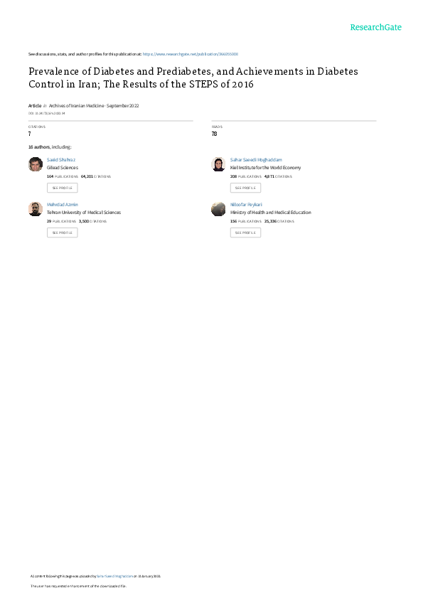 Prevalence of Diabetes and Prediabetes, and Achievements in Diabetes Control in Iran; The Results of the STEPS of 2016