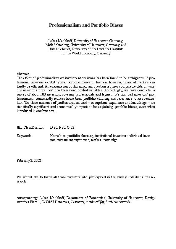 The effect of professionalism on investment decisions has been found to be ambiguous. If professional investors exhibit typical portfolio biases of laymen, however, financial markets can hardly be efficient. An examination of this important question requires comparable data on various investor groups, portfolio biases and control variables. Accordingly, we have conducted a survey of about 500 investors, covering professionals and laymen. We find that investors’ professionalism consistently reduces home bias, portfolio churning and reluctance to loss realization. The three measures of professionalism used – occupation, experience and knowledge – are statistically significant and economically important for explaining portfolio biases, even when introduced in combination.