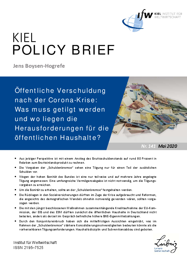 The author notes that from the current perspective, the gross debt ratio is expected to rise to around 80 percent in relation to gross domestic product. The "debt brake" only provides for repayment of part of the additional debt. Due to the high creditworthiness of the federal government, only partial repayment over several years is appropriate, so that a comprehensive capital levy is not necessary to achieve the repayment targets. The author stresses that the "debt brake" should be preserved in order to maintain this credit rating. With regard to the social security funds, it is stated that their reserves are likely to be depleted in the course of the crisis and that reforms that would have been necessary anyway in view of demographic change should take place earlier. By contrast, the public budgets in Germany are unlikely to be burdened initially by the borrowing of the EU Commission, the EIB and the ESM, unlike the higher GNI own resources payments currently under discussion. The author points out that the economic slump has clouded the medium-term outlook, which could require stronger consolidation beyond the foreseeable repayment requirements in the context of the "debt brake". Against this background, the author demands budgetary discipline and subsidy reduction.