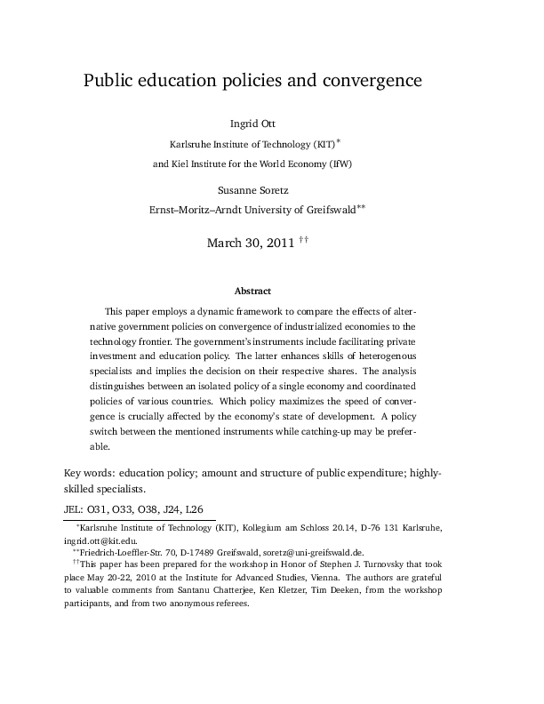 This paper employs a dynamic framework to compare the effects of alternative government policies on convergence of industrialized economies to the technology frontier. The government’s instruments include facilitating private investment and education policy. The latter enhances skills of heterogenous specialists and implies the decision on their respective shares. The analysis distinguishes between an isolated policy of a single economy and coordinated policies of various countries. Which policy maximizes the speed of convergence is crucially affected by the economy’s state of development. A policy switch between the mentioned instruments while catching-up may be preferable.