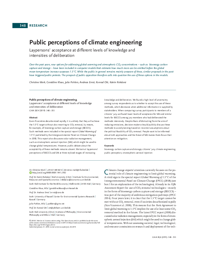 Even if societies decarbonized rapidly, it is unlikely that they will achieve the 1.5°C target without also resorting to CO2 removal, by means, for example, of bioenergy carbon capture and storage (BECCS). Such methods were included in the special report Global Warming of 1.5°C published by the Intergovernmental Panel on Climate Change in 2018. This report also discusses solar radiation management, such as stratospheric aerosol injection (SAI) which might be used to change global temperatures. However, public debate about the acceptability of these methods remains absent. We look at laypersons’ perceptions of BECCS and SAI at three stylized stages of increasing knowledge and deliberation. We found a high level of uncertainty among survey respondents as to whether to accept the use of these methods, which decreases when additional information is supplied by stakeholders. When comparing survey participants to members of a citizens’ jury, we found lower levels of acceptance for SAI and similar levels for BECCS among jury members who had deliberated the methods intensively. Despite fears of distracting from the aim of reducing emissions, decision-makers should publicly discuss these methods to avoid planning based on incorrect assumptions about the political feasibility of CO2 removal. People want to be informed about both approaches and the threat of SAI makes them focus their attention on mitigation.
